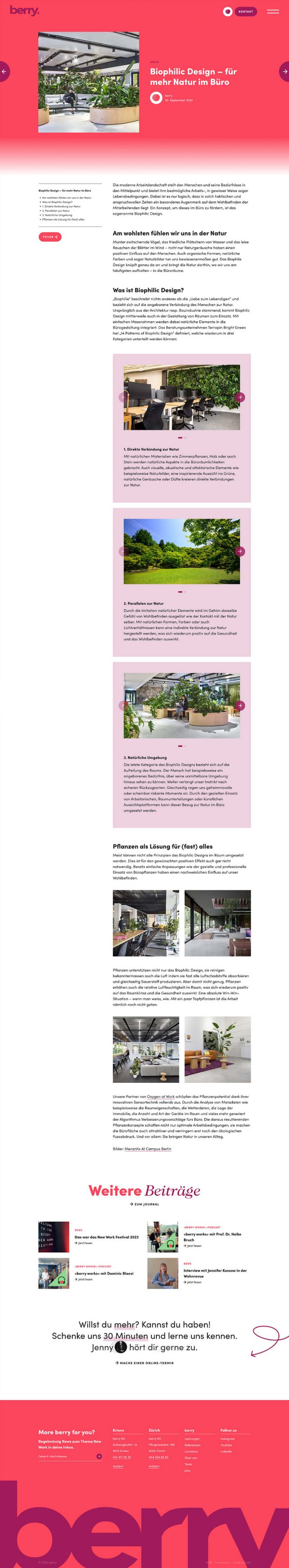 Die Fusion zweier Unternehmen führte zur Bildung einer neuen Marke „berry“. Diese Umstellung erforderte die Erstellung einer modernen Website, die Frische und Innovation widerspiegelt. Der gesamte Prozess, von der Konzeption bis zur finalen Umsetzung, wurde innerhalb eines engen Zeitrahmens von drei Monaten erfolgreich abgeschlossen.